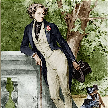 Un teint d’orange ou de citron, les cheveux en flamme de pot à feu, des sourcils paraboliques, des yeux excessifs, et la bouche dédaigneusement bouffie par une fatuité byronienne, le vêtement vague et noir, et la main nonchalamment passée dans l’hiatus de l’habit.