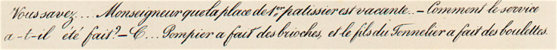 Monsieur Guitrel [l’abbé Guitrel, professeur d’éloquence sacrée au grand séminaire] a coutume de se rendre tous les jours, à cinq heures de relevée, dans la boutique de dame Magloire, pâtissière, place Saint Exupère. Et là, penché sur les buffets, les consoles, les tables il examine avec un intérêt profond et une assiduité laborieuse les friandises amassées dans les assiettes et dans les plats. Puis, s’arrêtant à l’endroit où sont dressées ces sortes de gâteaux qu’on m’a dit se nommer éclairs et babas, il touche du bout du doigt une de ces pâtisseries, puis une autre, et il fait envelopper ces bagatelles de bouche dans une feuille de papier
