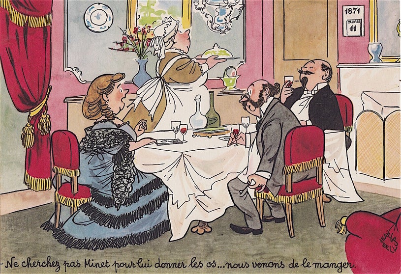» Cependant, notre aimable amphitryon se met hardiment à découper cet étrange gibier qui exhale de délectables senteurs, et faisant passer le plat :
