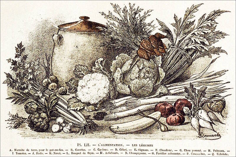 Nous vous avons conseillé d’en séparer les os, non pas que nous exilions les os du pot-au-feu, bien au contraire, nous leur y gardons une place à part, seulement nous les brisons avec un maillet, attendu que plus ils sont brisés, plus ils rendent de gélatine, et nous les mettons dans un sac de crin avec tous les débris de poulet, de lapin, de perdreaux, de pigeons rôtis qui peuvent se trouver dans le garde-manger, restes du dîner de la veille. Maintenant, vous pouvez mettre votre marmite sur le feu, vous savez sans doute que mieux vaut une marmite de terre qu’une marmite de fer ; faites-la chauffer lentement, ou sinon la viande saisie à la trop grande chaleur, l’albumine se coagulera à l’intérieur, ce qui empêchera l’osmazôme de se dissoudre et vous donnera un bouillon sans sapidité. Bien écumée et quand elle commence à bouillir, je prends le contenant pour le contenu, quand elle commencera de bouillir, salez-la, mettez-y selon sa contenance trois ou quatre carottes, trois ou quatre navets, deux panais, un bouquet de céleri et de poireaux ficelés ensemble ; enfin, trois oignons, dont l’un piqué d’une gousse d’ail et les deux autres d’un clou de girofle.