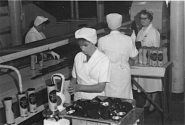 La fabrication des gaufrettes Cornish Wafers, vers 1960. Ce biscuit fut le produit-phare de 1954 à 1967, puis il fut repris par la firme Butter Osborne.