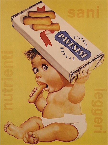 De l’importante publicité conçue pour les Pavesini se détachent : la superbe affiche de Gino Boccasile (1948), figurant un bébé sortant d’un œuf, un biscuit à la main ; l’affiche de Gian (Carlo) Rosseti (1972), reprenant ce thème de l’enfance, à travers l’image d’un bébé langé grignotant un biscuit ; l’Abecedario dei Pavesini (1968), recueil « abécédaire » animalier dû au talent d’Erberto Carboni et composé de planches au dessin raffiné ; et les dessins humoristiques de l’artiste livournais Alberto Fremura. Parallèlement, à partir de 1963, une petite figurine à tête de souris, conçue par Maria Perego et baptisée Topo Gigio, constitua l’emblème de la marque, dans tous les médias.